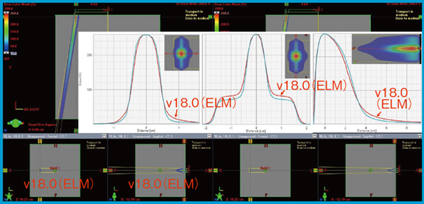Eclipse v18.0では,機能の進化により,さまざまな高精度放射線治療の計画を立てやすく進化しているが,それを支えるモデリングの部分から強化されている。高精度放射線治療計画の複雑さが増す中,これまでのMultileaf Collimator (MLC)モデリングは,dynamic MLCのアパーチャーの動作における線量計算で誤差が生じるという課題に直面していた。以前のMLCモデリングは,ラウンドリーフ形状ではなく,リーフエンドを直線とした簡略化されたMLCモデルを使用していた。MLCがより複雑に動作する高精度放射線治療において,より高精細なモデリングを採用することは,線量分布を計算する上で重要となる。そこで,Eclipse v18.0では,強化されたMLC減衰モデルであるELMが搭載された。ELMは,ラウンドリーフ端形状,ドライブスクリューの切り抜き,およびリーフ本体の厚さが考慮されており,より実測に近い計算ができるようになった(図1)。Van Eschらの研究論文1)では,ELMがMLCの先端と軸外線量分布のモデル化において優れていることが示されている。小照射野を使用した高精度放射線治療が増加している現在の放射線治療では,この進化は重要となる。
