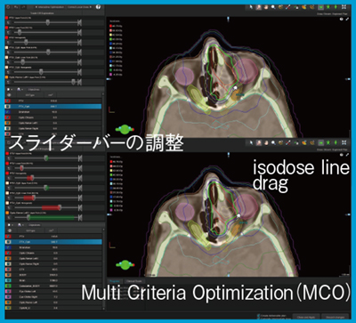 MCOでは,スライダーバーを用いてターゲットとリスク臓器(organs at risk:OAR)のトレードオフ関係をダイナミックかつリアルタイムに調整できる。新たにマウス操作によって等線量曲線のラインを直接つかんで動かすことで,局所の線量補正が直感的に行えるisodose line drag機能が使用できるように機能強化された(図2)。このMCOは,複数の最適化結果を基に,計画者がスライダーバーを利用し視覚的に線量分布,dose volume histogram(DVH)を確認しながら,臨床的にバランスの取れた治療計画の立案を支援する機能である。MCOを使用することで,ターゲットの線量を維持しながら,OARの線量をさらに削減できる可能性があるかを確認することができる。従来であれば,最適化パラメータを調整し,手動で見つけていた作業であり,MCOのトレードオフ関係による比較がなければ,OAR線量のさらなる削減の可能性に気がつけないこともありうる。MCOの利点は,このような今まで確認できなかった最適解の短時間での発見や,通常のマニュアルの最適化では見つけることのできないプランの限界を把握できる点にある。マニュアルで最適化された計画の多くは,まだ調整の余地があったのではないかという疑問を,トレードオフの調整方法としてisodose line dragでは,マウス操作によって等線量曲線を直接つかむことで局所の線量補正が直感的に行えるようになり,解消した。