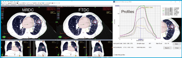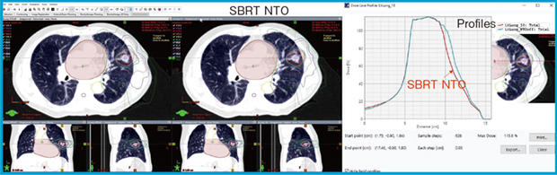 Eclipseの「HyperArc」に搭載されているSRS NTOは,頭部定位放射線治療において,標的間を含む正常脳への線量を抑えた治療計画を簡便に立てられるようになっている。さらに,本バージョンでは,体幹部定位放射線治療におけるNTO(SBRT NTO)が新たに搭載可能となり,extracranialにおいても急峻な線量分布を簡便に作成できるようになっている。肺がんSBRTのケースでは,線量の広がりを抑えた急峻な線量分布を作成することができている(図3)。