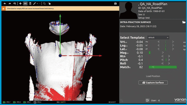 当院ではこれまで,TrueBeamを用いた単一装置による臨床運用を行ってきたが,2025年1月の新病院移転に併せてHalcyon version 4.0が増設された。TrueBeamはCBCTによる画像照合において6軸での寝台による位置補正が可能であるが,Halcyonは並進方向の3軸のみの補正となる。すなわち,回転方向の位置誤差は手動で補正しなければならない。そこで,当院では,Halcyon導入に伴い体表面画像誘導放射線治療(surface guided radiation therapy:SGRT)を実現するシステムである「IDENTIFY」(バリアン社製)を同室に設置した。IDENTIFYは,3台のSGRTカメラで体表面情報を6軸方向かつサブミリメートルの精度で検出することができる。光学式システムを採用することで,被ばくなく体表面の位置誤差情報がリアルタイムに表示される。図2に当院のHalcyonとIDENTIFYの設置状況を,図3に体表面のモニタリングと位置誤差情報が表示された状況を示す。