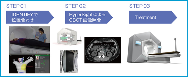 図4に,当院における患者位置合わせから照射までのプロセスを示す。これまでは治療室内で皮膚マーキングと位置合わせ用レーザーを照合していたが,上記のシステム導入に伴い,現在はIDENTIFYが出力する体表面の位置誤差情報を用いて患者の位置合わせを行っている(位置合わせ用の室内レーザーもあるため皮膚へのマーキングは実施している)。その後,HyperSightにてCBCT画像照合を実施し照射するプロセスとなるが,例えば前立腺がんに対する3Arcの強度変調回転放射線治療にかかる治療時間はおよそ5分であり,スループットの大幅な改善が確認されている。