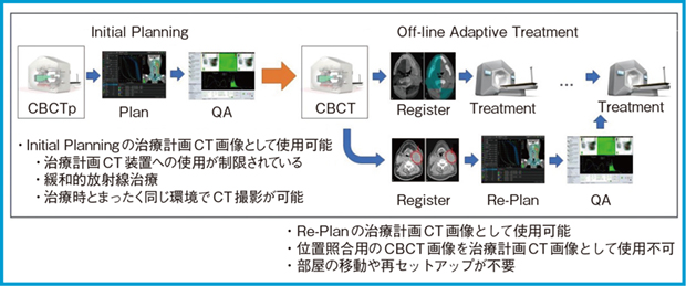 当院のHyperSightには,本邦初となるCBCT for planning(CBCTp)が搭載されている。CBCTpは,治療計画CT画像を撮影するための専用モードである。図5に,バリアン社より提案されているCBCTpを用いた新しいワークフローを示す。CBCTpで取得したCBCT画像は,Initial PlanあるいはRe-Planの治療計画CT画像として使用可能とされている。また,治療中の位置照合のために撮影したCBCT画像も,Re-Planの治療計画CT画像に使用可能とされている。治療時とまったく同じ環境でCTシミュレーションが可能であり,海外では緩和的放射線治療においてすでに臨床使用されている技術である。今後,当院では治療継続中に起こる体形変化や腫瘍サイズの変化が原因でRe-Planが必要となる症例に対しCBCTpを用いることで,Off-line Adaptive Radiotherapyが実施できるよう準備を進めていきたいと考えている。