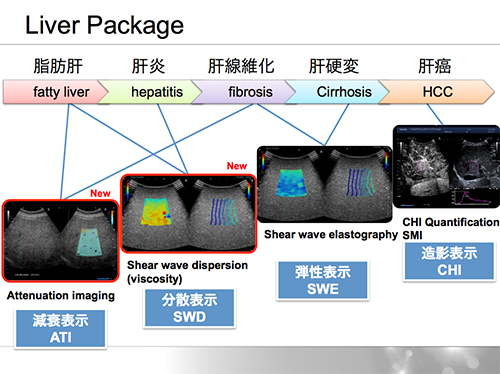 せん断波の伝播速度を測定し,組織の硬さや数値をカラーマップで表示するShear wave Elastography(SWE)だけでなく,Shear waveの周波数成分毎の伝播速度のばらつきを解析することで組織の粘性を推定するDispersion map for SWEや組織内の超音波周波数依存性減衰の程度を計測することができるAttenuation Imaging(ATI)などの先進のアプリケーションを用いて,特に肝疾患の早期かつ包括的な診断への応用に期待されています。