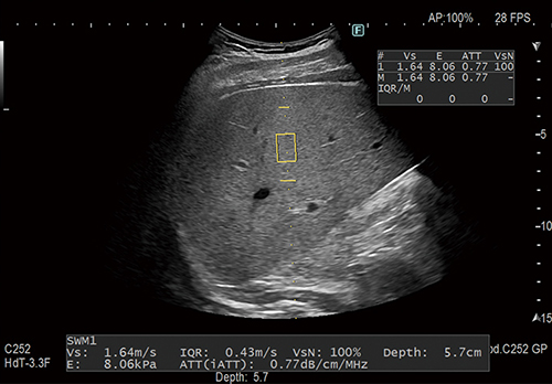 組織にせん断波を発生させ,伝搬速度(Vs)を計測することで硬さを評価できます。肝脂肪化の程度を推定するための指標(ATT)も同時に計測します。