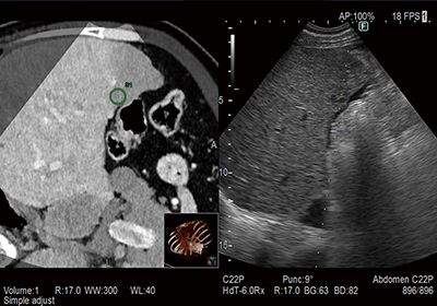 CT・MRI・超音波診断装置のボリュームデータから作成したMPR画像を超音波画像とリアルタイムで同期させる機能です。超音波検査だけでは発見しづらい小さな病変の発見や,治療部位の決定など安全かつ正確な治療への貢献が期待されます。
