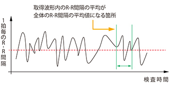 不整脈時代表波形取得機能では,計測開始からの心電図波形のR-R間隔を計測します。そこから脈波計測全体でのR-R間隔の平均値に近いR-R間隔の脈波を代表波形として取得します。