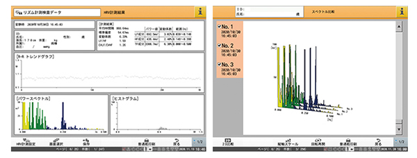 最短2分間の心電図から,R-R間隔,パワースペクトルを分析したものをグラフとして表示します。また周波数ごとに確認しやすいよう色分けしています。さらに,スペクトル比較画面では,3Dで複数の結果を角度を変えて表示することが可能です。