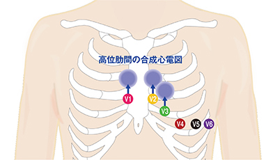 ブルガダ型心電図の検出に有用なV1~V3誘導の高位肋間心電図を作成・解析することができます。これにより,標準12誘導では捉えきれないブルガダ型心電図の疑いを感知し検出率を高めます。