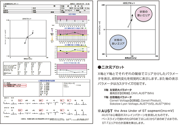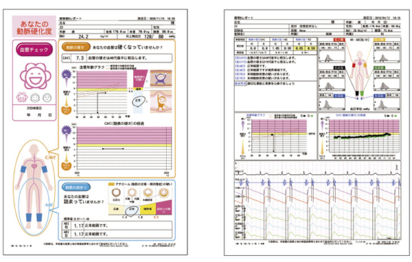医療施設用,被検者用の複数のレポートからお選び頂けます。 レポートはオプションのサーマルレコーダや,カラープリンタなどから印刷可能です。 また,総合的な管理が必要な血管障害への経時的管理のサポートとして「心血管時系列レポート」を新たに開発しました。