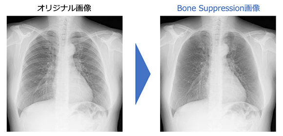 Bone Suppression処理は,独自の胸部X線画像データベースと解剖学的な情報・知識を利用した高度なアルゴリズムで,胸部X線画像から前方肋骨,後方肋骨,および鎖骨の信号成分を推定し,減弱する画像処理技術です。医師が頭の中でイメージしている,「鎖骨/肋骨の減弱像」を可視化することで,肺野内の骨に重なる病変の視認性を向上させ,「見えにくい病変の見落とし防止」を強力にサポートします。
