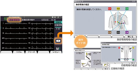 胸部,四肢電極の貼り間違い等をエラーメッセージでお知らせ。ワンタッチでイラストつき操作ガイドを表示,対処方法がわかりやすいようご案内します。