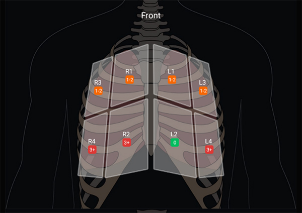 B-Lineカウンティング機能は,肺炎などで発生するB-lineを自動計測し,リアルタイムで表示します。新型コロナウイルス感染症などの肺エコーにおいて,客観的で視覚的な評価をサポートします。