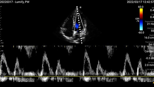 全てのトランスジューサにおいてパルスドプラによる血流速度の評価が可能です。さらに,自動調整機能により,ワンボタンでの波形の最適化が可能です。