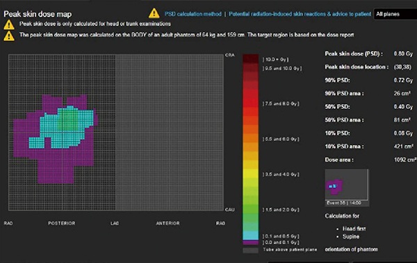 視覚的に皮膚線量を評価することが可能となり,患者の背部を観察する際,どこに注目して診察をすればよいかが一目瞭然で,皮膚障害の有無を精度良く検出することが可能である。