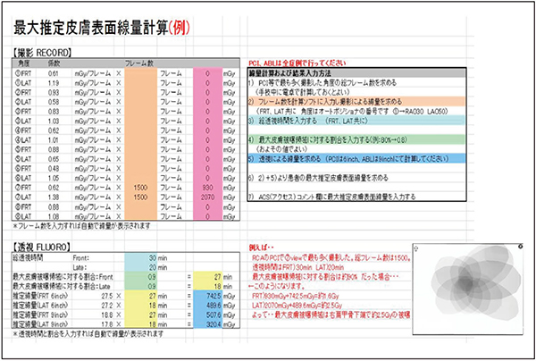 そこで,検査終了後,総被ばく線量が3Gy以下の場合は線量の記録のみ,3Gyを超えた場合は照射角度ごとの患者皮膚被ばく線量が2Gyを超えたかを評価することとし,図1のようなシートを作成し管理していた。