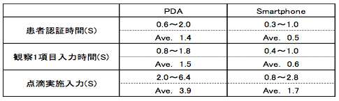 調査の結果,入力時間は短縮し,PDAと比べて入力業務の負荷を減少させる効果を得た。入力時間が短縮した理由として,患者ID認証作業をPDAではWebアプリで行っていたのに対し,ワタツミはネイティブアプリで行ったこと,カメラのオートフォーカス機能を利用することで画面展開速度が速くなったことが考えられる。