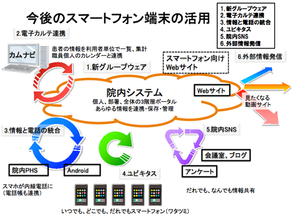 ワタツミの開発・導入では,入力業務の軽減と機器更新の費用軽減とともに,スマートフォンの機能(電話,メール,動画配信など)を利用した医療専門職の間でのコミュニケーション促進を想定した。