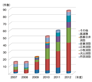 iPadを関連する地元6消防署の司令室に配置し,救急救命士が活動する現場で,医師の必要が生じた場合に,ドクターカーの出動要請を受けている。こうしたニーズは年を重ねるに従い,多くなってきている(図1)。この場合には,救急現場の詳細な位置情報が必要となる。筆者は高速道路の重大事故において過去30年間以上,現場での死体検案を行ってきた。東名,名神,中央道は上下線,および何キロポストの表示で位置が特定できるので,比較的容易に,また的確に現場へ出動できた。一方,救急救命士が活動できる内容であればよいのだが,家屋閉じこもり,車内での救出困難例や高所転落,さらに疾病による搬送拒否などの症例は一般住居地が多く,そうしたところへの医師の現場出動が要請される。救出困難例や現場での高度な医療処置が必要な例については,消防署に配布したiPhoneにより現場画像の転送を受け,状況によってはさらなるドクターカーの二次出動を行っている。特に,労災事故における巨大機械への巻き込みによる上肢,または下肢の高度な挫滅例においては,受傷患者の搬出のために現場での四肢の離断が必要になる場合もある。そのため,現場の位置情報,患者の年齢,性別,主訴などの情報を知ることが非常に重要である。また,外傷の場合の創傷の部位,状態など詳細な情報がその後の的確な治療へとつながる。