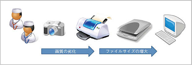 従来,当院の電子カルテに画像データを添付するためには,非常に多くのプロセスを経る必要があり,保存される画像の画質も低かった。デジタルカメラ(以下,カメラ)で撮影した画像データを,カメラとPCを接続し近傍のプリンタから紙媒体へ出力後,スキャナで電子カルテ内にスキャンデータとして保存していた(図1)。これらの問題を改善し,良質な診療記録の作成を行うための一助として,iPad miniを導入することとした。