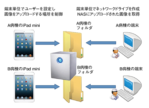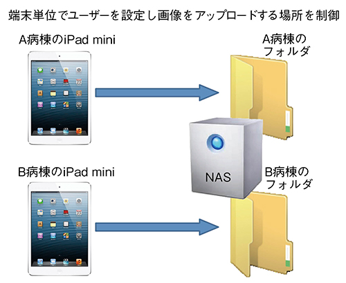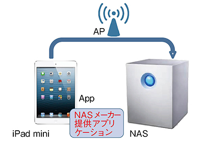 (4) iPad miniからNASの連携については,NASメーカーより提供されているアプリケーションを利用した。撮影したデータは既設のAP経由でNASにアップロードする(図4)。