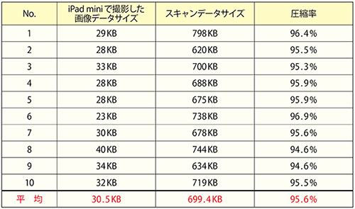 (2) 従来の方法でのデータサイズは平均699.4KB〔画像サイズ:L判(89mm×127mm)〕で,iPad miniを利用した方法ではデータサイズが平均30.5KBとなり,95.6%のファイルサイズの圧縮を図ることができた(表1)。