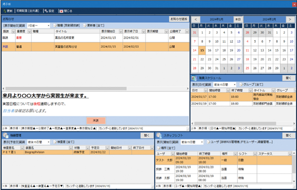 この機能は,職員スケジュールや撮影装置の点検予定などの情報をまとめて表示する機能です(図2)。装置点検や勉強会の予定,部内の共有情報を1つの画面でまとめて表示することで,検査以外の業務に必要な情報を一か所で確認することができます。近年,働き方改革の一環で朝礼がなくなり,情報共有の場が減っている施設もあるため,部内の情報共有を進めるためにぜひご活用いただきたいお薦めの機能です。掲示板機能のレイアウトはユーザー側で調整可能で,加えてACTRISのダッシュボードの中に組み込むことができ,ユーザー自身で確認しやすいように表示画面を調整できることも特徴です。