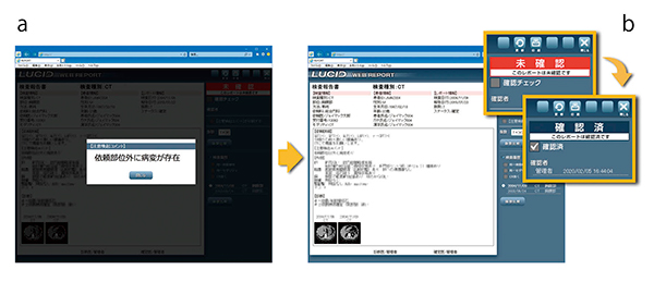 所見本文の重要ポイントの見落としなどの防止対策として,クリティカルな所見などについては配信レポート参照時に注意喚起アラートが起動し(図1 a),読影医からの伝達コメントを表示する機能である。