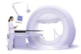 追尾照射機能搭載の放射線治療装置Vero4DRTは,呼吸などにより揺れ動くがん患者の病巣をリアルタイムにモニタリングしながら追尾し,狙った病巣のみをピンポイントで連続照射できる最先端医療システム。