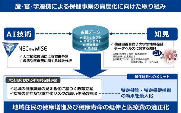 大分県では,当該因子に基づき対象者を絞り込み,各保険者の効果的な個別指導につなげることで,保健指導の高度化と医療費の適正化を図る。NECは,仙台白百合女子大学と連携し,引き続き保健・医療・介護分野におけるデータ利活用を進め,自治体における健康増進と医療の効率的な提供を推進していく。