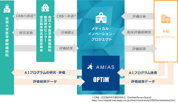 佐賀大学とオプティムは,国内外のAIプログラムメーカー向けに次世代医療の促進を目指すことを目的として本プロジェクトを立ち上げる。AIプログラムメーカーは,AMIASと連携することで臨床研究を進めるためのシステム接続の調整などをスムーズに行うことができ,加えて佐賀大学医学部附属病院における臨床研究も実施することができる※2。