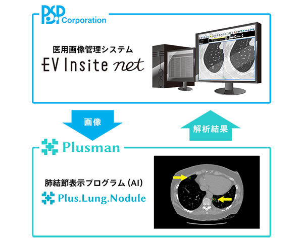 PSPは,国内1000施設以上の医療機関に医用画像管理システム(PACS)「EV Insite net(イーヴイインサイトネット)」の販売実績をもつシステムベンダー。Plus.Lung.Noduleとの連携により,AIプログラムの解析結果をPACSビューアー上に表示し,医師の診断を支援する。