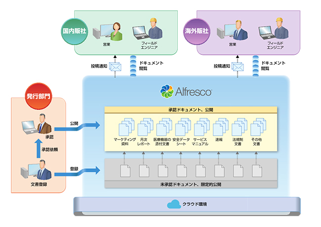 具体的には,発行部門が文書をAlfresco上に登録すると,それらが公開承認フローに回されるように設計されており,承認された文書のみがAlfresco上で公開されるシステムを構築した。承認された文書は,国内外からの閲覧が可能。Alfresco導入前の同事業部では,国内外で別システムを運用しており,全社での統一された文書管理に課題があったが,今回のシステム刷新においてAlfrescoを選定の結果,国内外で統一したシステムを利用することで管理作業の効率化に成功し,利用者側の可用性を向上させた。