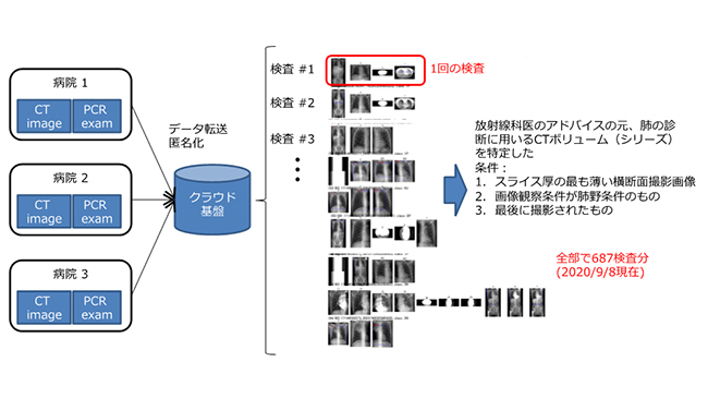 医療画像AIの研究開発では,AIを学習させるために,一病院だけではなく,様々な病院で取得された多様で高品質な画像データ群が極めて重要でである。そのため,今回のCOVID-19肺炎のCT画像データベース構築と解析プラットフォームの開発では,NIIと日本医学放射線学会をはじめとする6つの医療画像に関連する臨床学会が中心となって進めAMEDが支援する研究プロジェクト「臨床研究等ICT基盤構築・人工知能実装研究事業」の「医療ビッグデータ利活用を促進するクラウド基盤・AI画像解析に関する研究」(*7)を活用した。