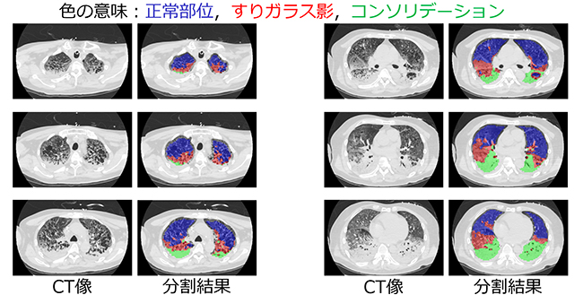 図3 COVID-19肺炎典型度を判定するAIによる部位の分割結果。空気に富む肺胞領域はCTではX線透過率が高いために黒っぽく映る(正常部位)。ここに炎症が起こるとX線透過率が低下してすりガラスのような陰影を呈する(すりガラス影)。さらに細胞浸潤が激しくなると,いっそうX線透過率が低下して白く一様な陰影となる(コンソリデーション)。