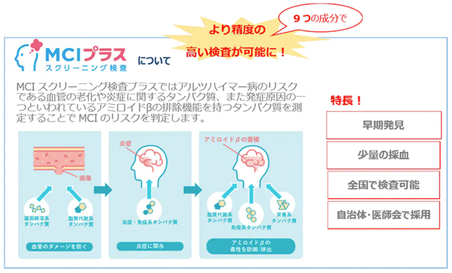 認知症の6割以上を占めるアルツハイマー病は,発症の約20年前から原因の主要物質であるアミロイドベータが脳内に溜まり始めるといわれている。健常と認知症の中間であるMCIの段階で,適切な予防や治療を行えば,認知症の発症を防いだり遅らせたりすることが期待できる。「MCIスクリーニング検査」は,MCIの発症リスクを栄養・脂質代謝・免疫に関連する血液中のタンパク質により評価する検査。MCBIは2015年5月より全国のクリニックや健診センターなどを通じて,のべ6万人以上に同検査を提供してきた。今回提供を開始する「MCIスクリーニング検査プラス」は,分析対象を3個のタンパク質から9個のタンパク質に増やすことで,より高精度な検査精度を実現できた。