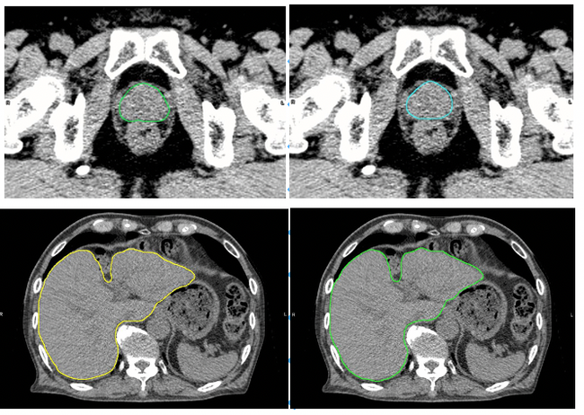 図の上は前立腺,下は肝臓のCT画像。左はAi-Segによる自動抽出,右は医療従事者の手入力による抽出。Ai-Segによる描画は医療従事者による描画と遜色ない精度で輪郭を自動作成が可能(図の提供:大阪大学プレスリリースより※)