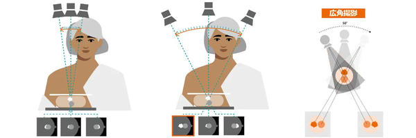 トモシンセシスはさまざまな角度から撮影したプロジェクション画像を一旦ボリュームデータとして取得し,3D(トモシンセシス)画像として再構成する技術で,撮影確度が広角にわたるほど,深度分解能(深さ方向の分解能)に優れ,正常組織に隠れた病変などを描出しやすくなる。MAMMOMAT B.brilliantは,従来機種と同様,業界最大の振り角50度の広角撮影により,乳房内の病変の早期検出に貢献する。