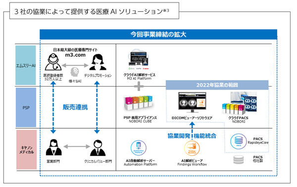 キヤノンメディカルシステムズが得意とする「AI解析技術」や「3D処理技術」のライセンスをPSPが有する読影用の「DICOMビューアーソフトウェア」に提供する。さらにPSPとエムスリーAIが共同で推進している医療AIプラットフォーム事業について,キヤノンメディカルシステムズが販売連携する。