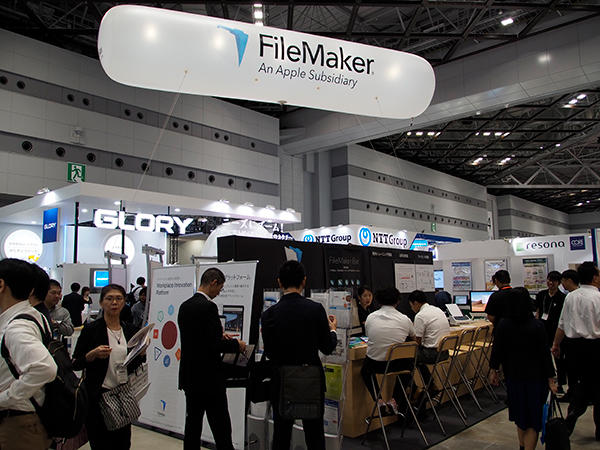 ファイルメーカーは,例年通り,ワークプレイス・イノベーション・プラットフォームのFileMakerでヘルスケア向けのソリューションを開発するFBA(FileMaker Business Alliance)の紹介と,FileMakerのよろず相談コーナー“FileMaker Bar”,最新バージョン「FileMaker18」の機能やFBAのカスタムAppを紹介するプレゼンテーションコーナーでブースを構成した。最新の「FileMaker18プラットフォーム」は2019年5月に発売され,データインポート用のユーザーインターフェイスの刷新や新しいスクリプトステップの追加など機能の向上が図られている。