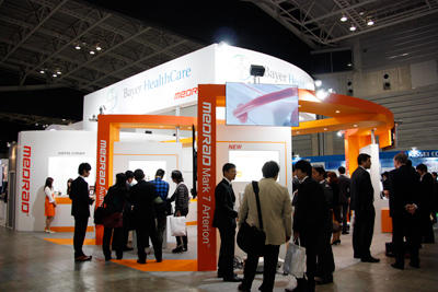 日本メドラッドは,ワイヤレスCTインジェクタ「SALIENT」など,新製品5製品を一堂に展示した。どの方向からも製品が見える開放的な造りのブースには,2012年1月に米国メドラッド本社と事業統合し,ラジオロジー&インターベンショナル(R&I)事業部を発足させたバイエルヘルスケア/メディカルケアのロゴも入り,機器と造影剤の組織が1つになることにより,より革新的なソリューションの提供をめざす姿勢をアピールした。(4月14日取材)