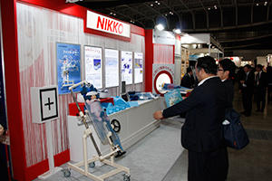 日興ファインズ工業は,近年導入が増えている乳幼児立位・臥位撮影台「ファンティクサー」,「PVAゲル封入MRIファントム」をはじめ, JN式ポジショニングブロック,小児排尿検査用固定具「VUリフラクサー」などを展示した。(4月17日取材)
