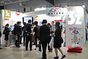 スリーゼットは,本を読み進めたくなる時のようなポップで楽しい空間にしようというコンセプトのデザインでブース展示を行った。これは,親しみやすい身近なPACSメーカーというスリーゼットのテーマから来るもので,ポップなブースデザインでユーザーとの距離感を少しでも縮めようという考えから来ている。また,新しいことをやりたい,新しい分野でも製品を生かしたいという想いから,今回は新しい技術の象徴としてPepperを導入し,WATARUの説明を行っていた。(4月16日取材)