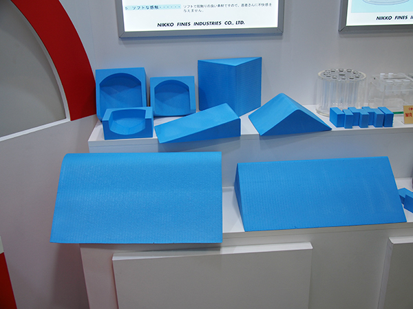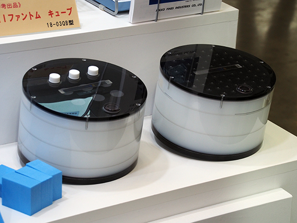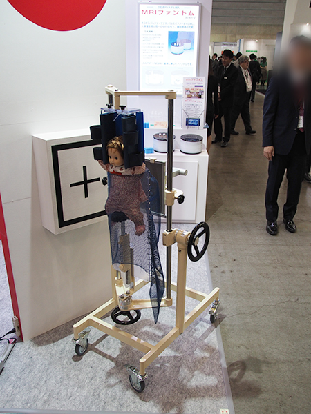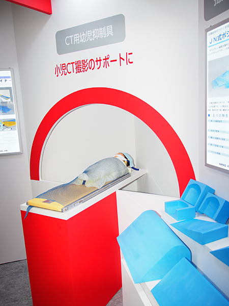 日興ファインズ工業は,4歳児くらいまでの乳幼児の胸腹撮影に使用されている乳幼児立位・臥位撮影台「ファンティクサー(FD-21型)」,長期間安定した測定が可能な日石式PVAゲル封入「MRIファントム 90-401型」とヘッドコイルを対象とした「MRIファントム キューブ 10-03QB型(参考出品)」,つい動いてしまう小児のCT撮影時の固定,安全確保を補助する「CTレストレイナー(CTR-15型)」,JN式ポジショニングブロックなどを展示した。