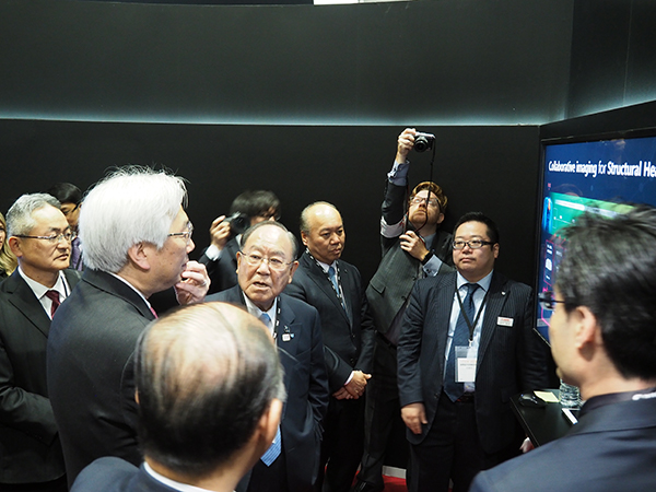 キヤノンの御手洗冨士夫代表取締役会長CEOも来場。ブース内で瀧口登志夫社長(手前)から説明を聞く。