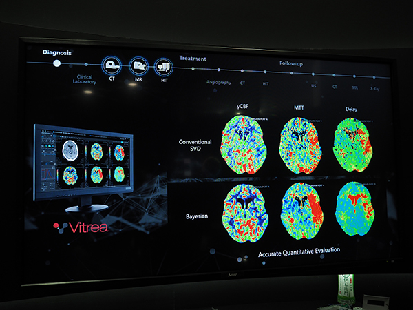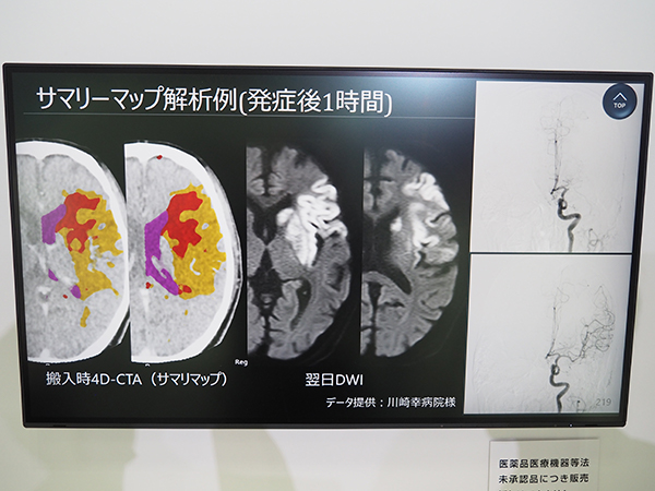 展示プレゼンテーションでは,疾患として「Stroke」「Structural Heart Disease」「Breast Cancer」の3つ領域を例に説明した。例えば,脳卒中診療の急性期から回復期までの患者ケアサイクルにおいて,急性期では治療の適応判断をサポートする“ベイズ推定アルゴリズム”を用いた”“CT 4D脳血流解析”の有用性を訴求,Aquillion ONEにより血行動態評価とペナンブラの評価が1回の撮影で行える点を強調した。ワークフローについては,AIとヘルスケアITの活用によって,特に院内で発生する膨大なデータマネジメントフローの改善に取り組んでいる最新の仕組みを紹介した。さらに,病院経営への貢献として,会計データとリンクしたデータ抽出により,病院ごとの最適な装置運用を解析し,改善を提案するサービスについても紹介した(日本での販売は未定)。