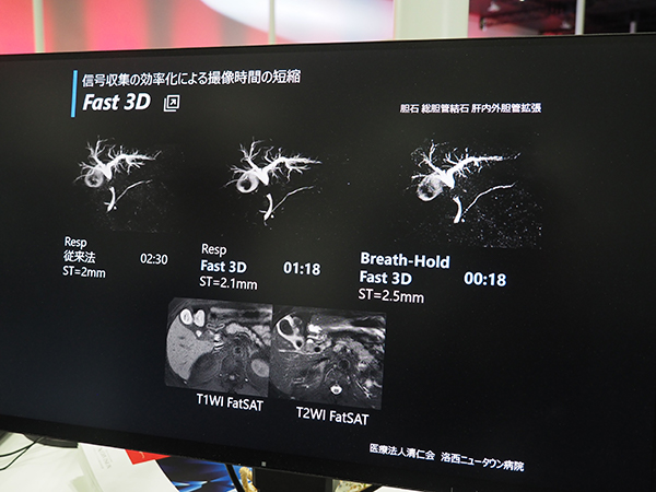 また,研究機として国内では5台が稼働中の3T MRI「Vantage Galan 3T ZGO」について,稼動サイトの放射線科教授を対象としたインタビューVTRと,AIを用いた画像再構成技術“DLR:Deep Learning Reconstruction(W.I.P.)”を用いた最新の臨床画像をディスプレイで紹介した。“Ultra Gradient system”であるZGOでは,最大傾斜磁場強度(Gmax)100mT/mという磁場強度での撮像が可能で,従来よりも高分解能画像の撮像ができる。ブースではDLRと組み合わせて実現された高分解能で低ノイズの臨床データを含めて紹介した。さらに,ブースではデザインが一新された3.0Tの新装置(W.I.P.)を展示。これは研究機であるZGOの一般販売モデルとして開発している装置とのことだ。