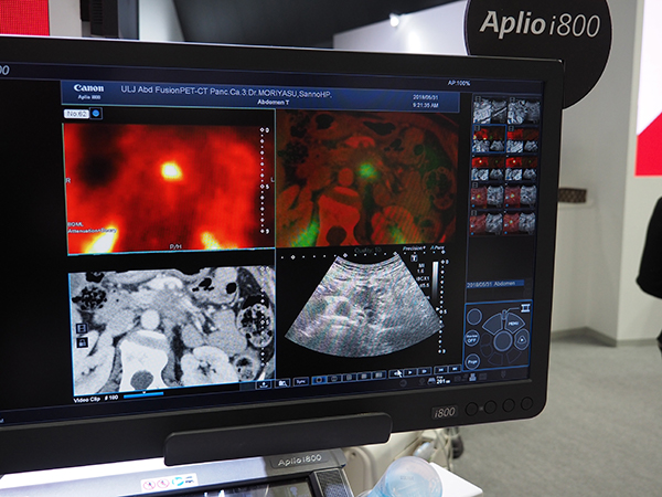Aplio i800のSmart Fusion。PET-CTの画像をQuad Viewで表示して穿刺をサポート。