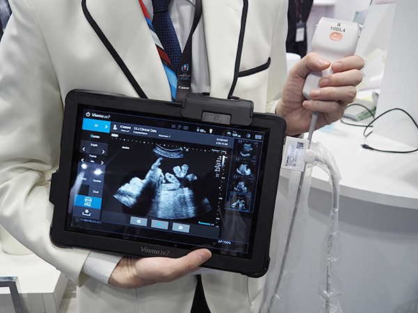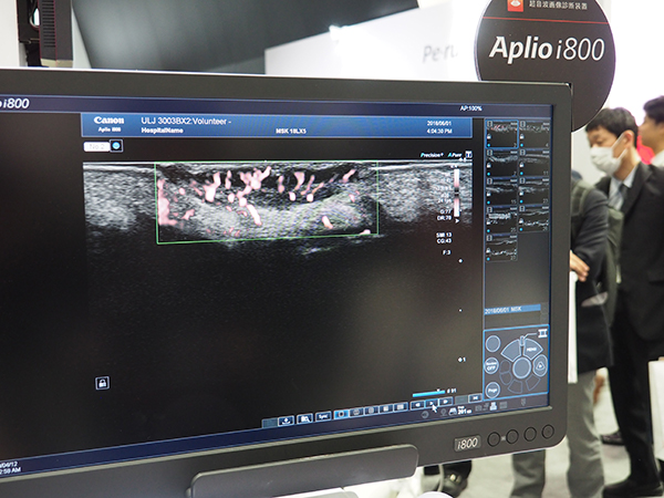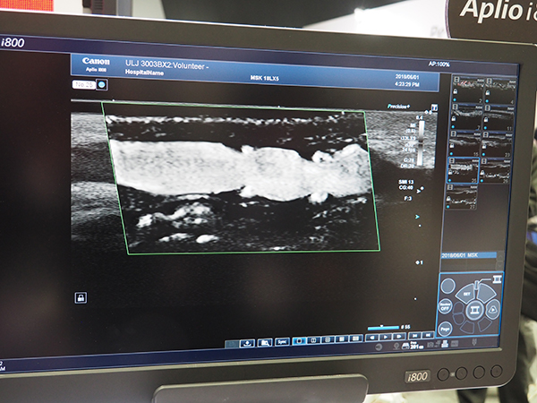 UL(超音波診断装置)では,“Aplio i-series”のフラッグシップである「Aplio i800」,昨年のITEM2018で初出展されたハイエンドの“Aplio a-series”から「Aplio a550」を展示した。Aplio i800では,CTやMR画像とのフュージョンによる“Smart Fusion”によって穿刺などをサポートできることを,実際にファントムを使ってPRした。従来のCT/MRに加えて,PET-CTにも対応し,Quad ViewによってCTの解剖学的画像とPETの機能画像を表示しながら,HIFUなどの穿刺治療が可能になる。また,世界初の超高周波リニアプローブである33MHz高周波リニアプローブ“PLI-3003BX”もITEMでは初めて出展された。PLI-3003BXでは,33MHzの高周波によって表在領域の微細な構造の観察が可能で,展示では“SMI(Superb Micro-vascular Imaging)”による血流や静脈弁周囲の血液のうっ滞などの高精細画像をアピールした。そのほか,2018年11月に発売したタブレット超音波「Viamo sv7」がITEMでは初展示された。Viamo sv7は,12インチのモニタで1回の充電で3時間使用することができる。病院内での持ち運びや在宅や訪問診療,スポーツ診療での利用が期待される。