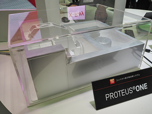 キヤノンメディカルシステムズは,2016年からベルギーIBA社の陽子線治療システム「PROTEUS ONE」の販売を行っている。PROTEUS ONEは,超伝導によって加速器(シンクロサイクロトロン)を小型化するなどでテニスコート1面分の面積で設置できるコンパクトな設置性の高さが特徴である。また,装置をコンパクトにしたことで短期間で施設立ち上げが可能で,従来の半分以下(これまでの実績で約9か月程度)で稼働しており,リニアック並みの運用を可能にする。220°のオープンガントリによって治療室部分も広くなっており,ペンシルビームスキャンによる精確な照射とあわせて高い設置性を誇る。ブースでは,模型を使ってコンパクトな設置性をアピールした。