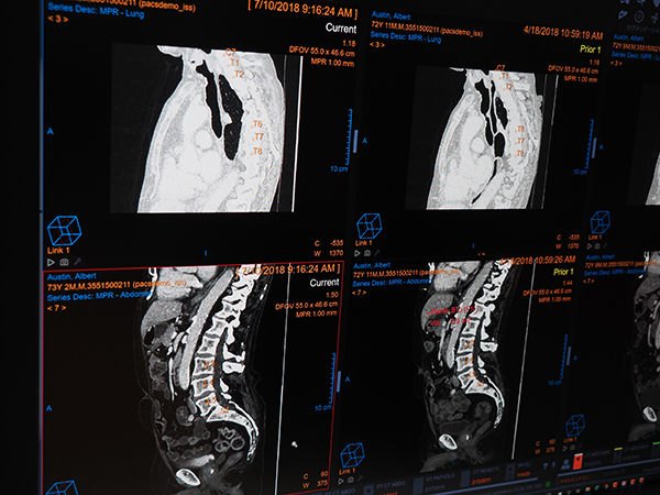 ゼブラ社のAIは,Vue PACS Clientに統合されており端末で対象画像を表示すると,判断した結果を示すポップアップウィンドウが開く。部位や画像種別に応じて適応されたAIプロセスがアイコンで表示されるが,所見なしの場合はアイコンが緑,所見ありでは赤で表示される。マウスオーバーで判断内容の詳細が表示される。AIの判定結果はワンクリックでレポートに転送されるように,システムとしての連携が図られていることを説明した。ゼブラ社のAIエンジンはCT,一般撮影,マンモグラフィなどで10以上のプロセスが開発されているが,FDAの承認を受けているのは,“肺気腫”“脂肪肝”“冠動脈石灰化”“骨密度”“脊椎圧迫骨折”の5つである。そのほか,ケアストリームヘルスが自社開発しているAIは,胸部CT画像での肺結節をはじめとした,病変の自動認識・抽出,脊椎ラベリングの自動化などで,従来からVue PACSで提供してきた機能を自動化する方向で取り組んでいるのが特徴だ。